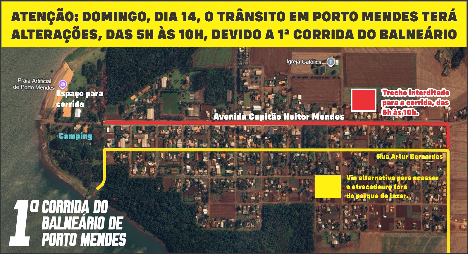 Em razão do evento, o trânsito em Porto Mendes terá mudanças neste domingo, entre 5h e 10h. A Avenida Capitão Heitor Mendes ficará interditada durante o período. Motoristas que precisarem acessar o parque ou pescadores que utilizam a região deverão seguir pela rota alternativa da rua Artur Bernardes, até o atracadouro localizado fora do parque.