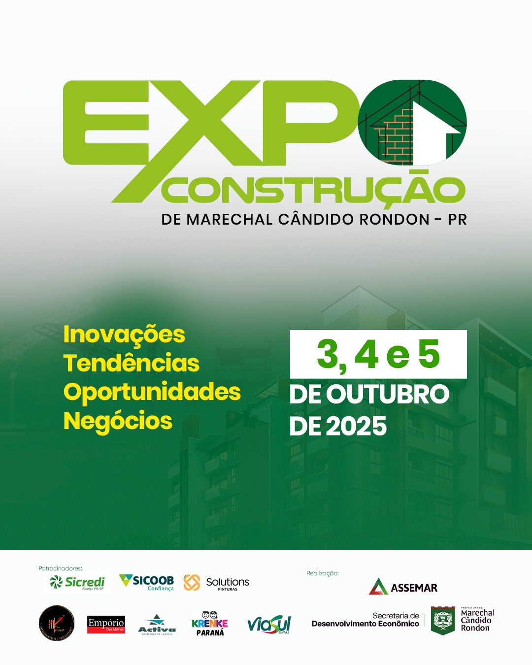 A prefeitura de Marechal Cândido Rondon, em parceria com a Secretaria de Desenvolvimento Econômico e a Associação dos Servidores Municipais (ASSEMAR), anunciou a realização da 1ª Expo da Construção Marechal 2025. O evento acontecerá nos dias 3, 4 e 5 de outubro, no centro de eventos do Parque de Exposições.