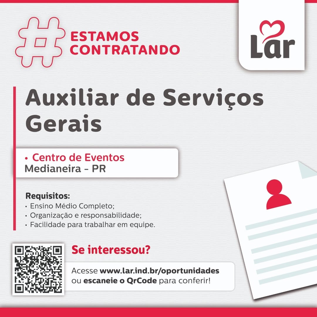 Se você está em busca de novas oportunidades de emprego em Medianeira (PR), fique atento! A Lar Cooperativa está com duas vagas abertas em diferentes áreas, com inscrições disponíveis até os dias 28 e 30 de julho de 2025.