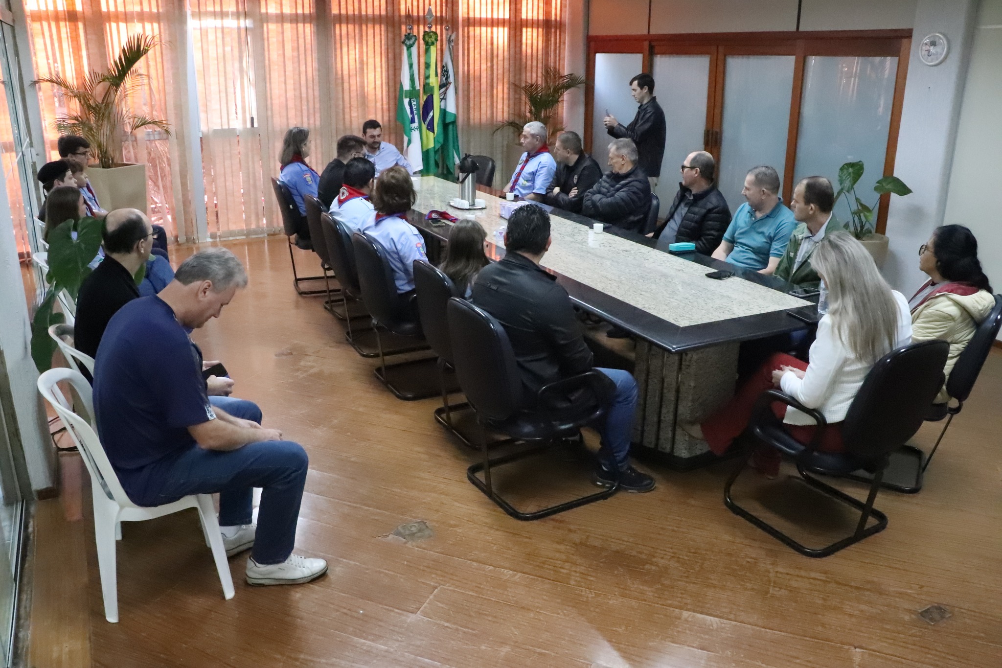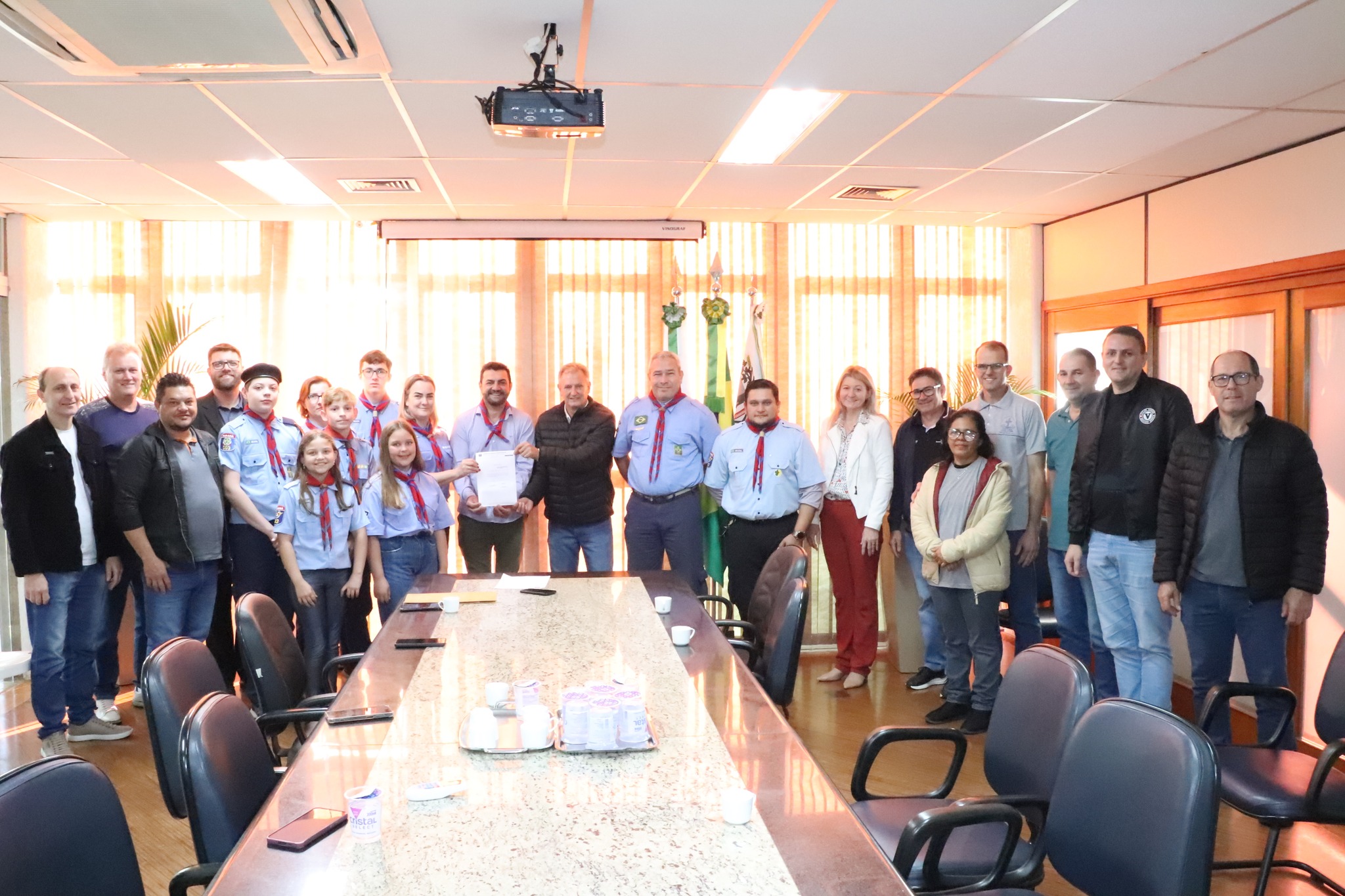 Na manhã desta quarta-feira (09), representantes do Grupo Escoteiro Harpia, acompanhados do pastor Heber Fach e membros da diretoria da Igreja Luterana Cristo é Vida, estiveram na prefeitura para oficializar o convite ao prefeito Adriano Backes para a cerimônia de abertura.