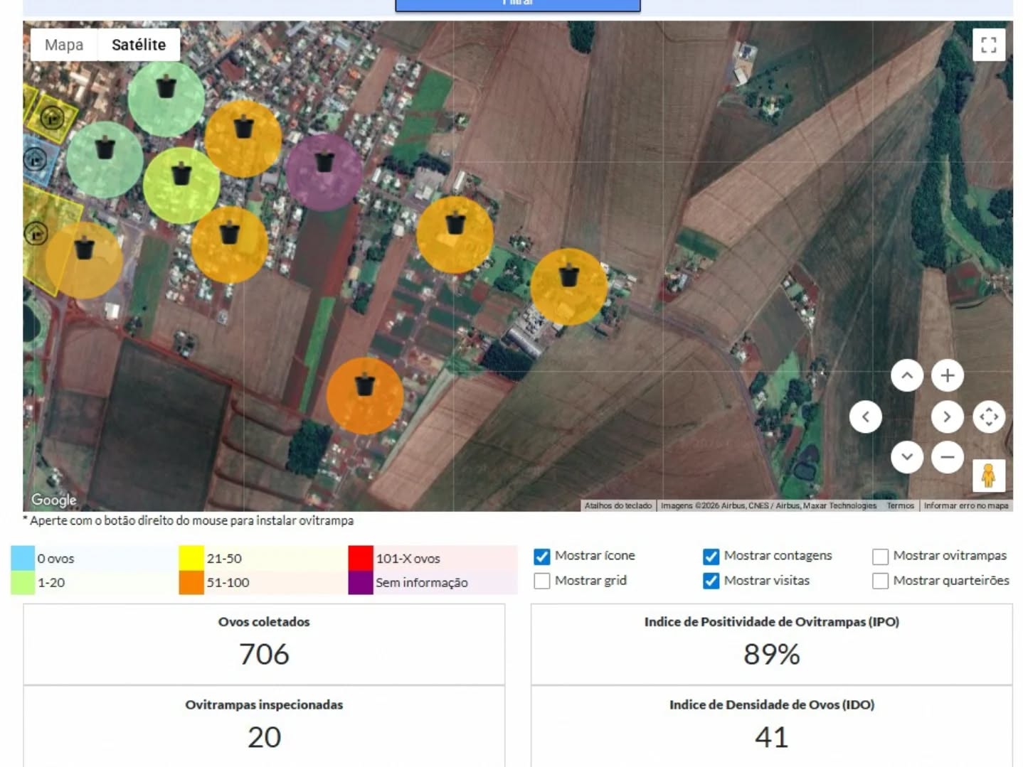 Ao todo, foram instaladas 110 armadilhas que registraram um total de 7.828 ovos do mosquito. O dado mais preocupante é o Índice de Positividade Geral (IPO), que atingiu 82%. Em linguagem simples: o vetor da Dengue, Zika e Chikungunya está circulando livremente na grande maioria dos locais monitorados.