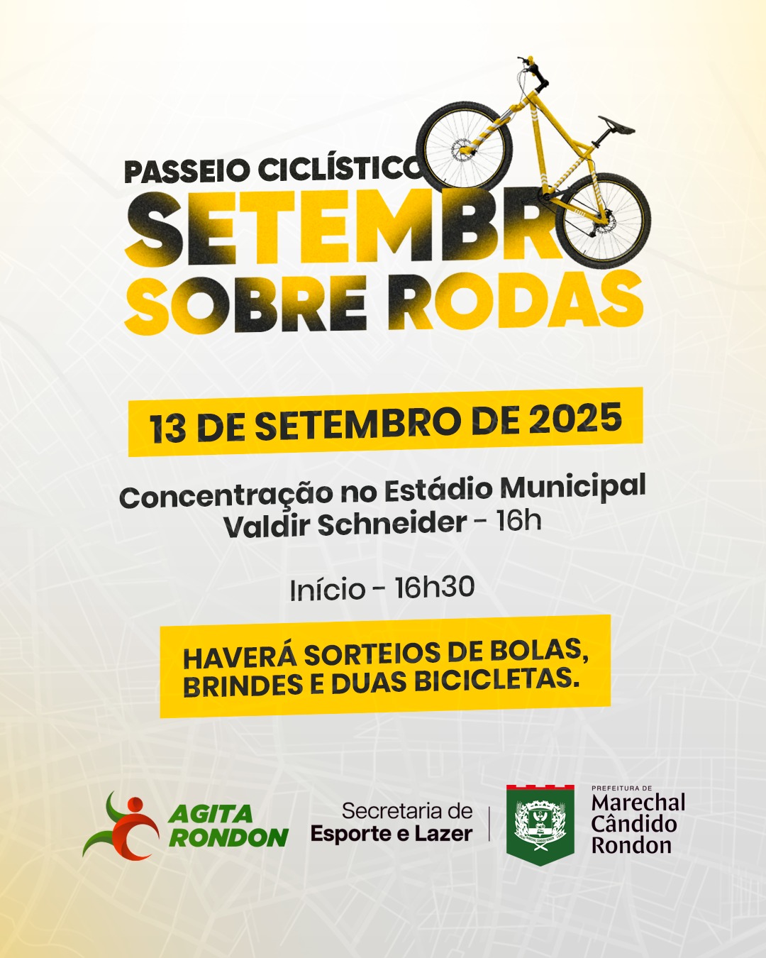 Agita Rondon 2025, Setembro Sobre Rodas Marechal Cândido Rondon, passeio ciclístico Marechal Rondon, evento esportivo Marechal Rondon, Prefeitura de Marechal Cândido Rondon, programação Agita Rondon, sorteio de bicicletas Rondon, Estádio Municipal Valdir Schneider, atividades esportivas Marechal Rondon, lazer e saúde Marechal Rondon, ciclismo em família Marechal Rondon, Secretaria de Esporte e Lazer Rondon, qualidade de vida através do esporte, agenda esportiva Marechal Rondon, eventos setembro 2025 Rondon