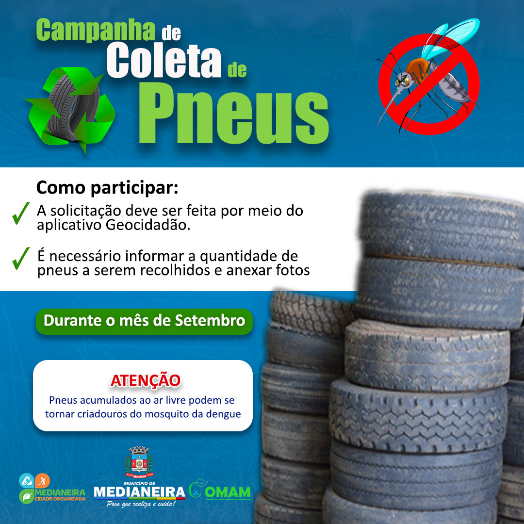 A recolha é gratuita e tem como objetivo evitar o descarte incorreto em terrenos baldios ou locais a céu aberto, onde os pneus podem acumular água e se tornar criadouros do mosquito transmissor da Dengue.