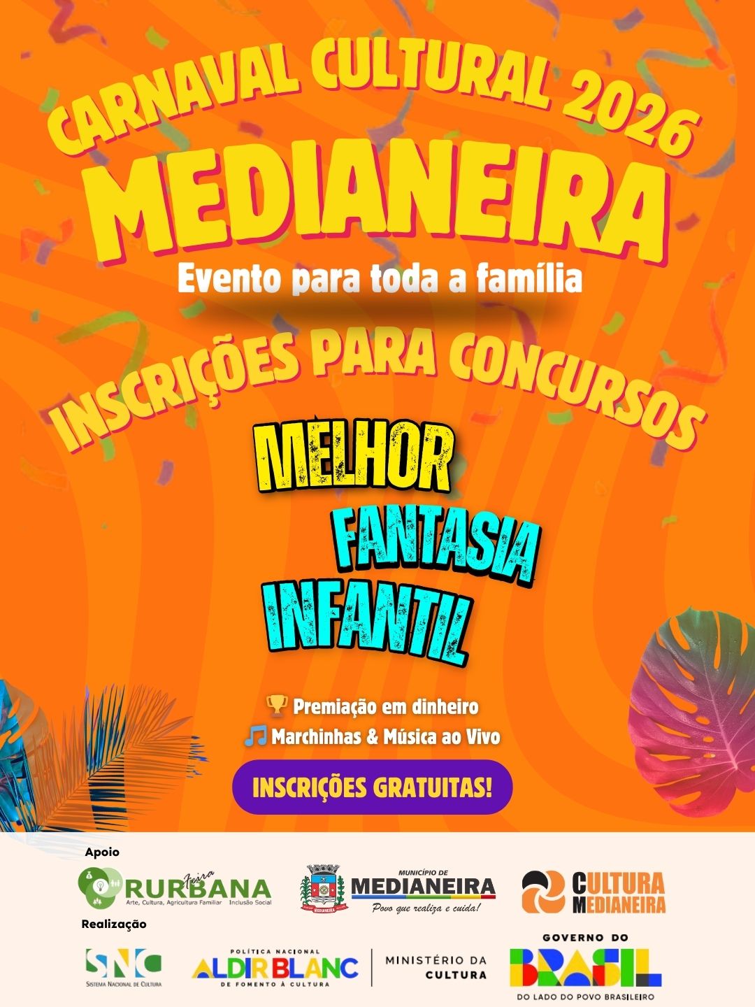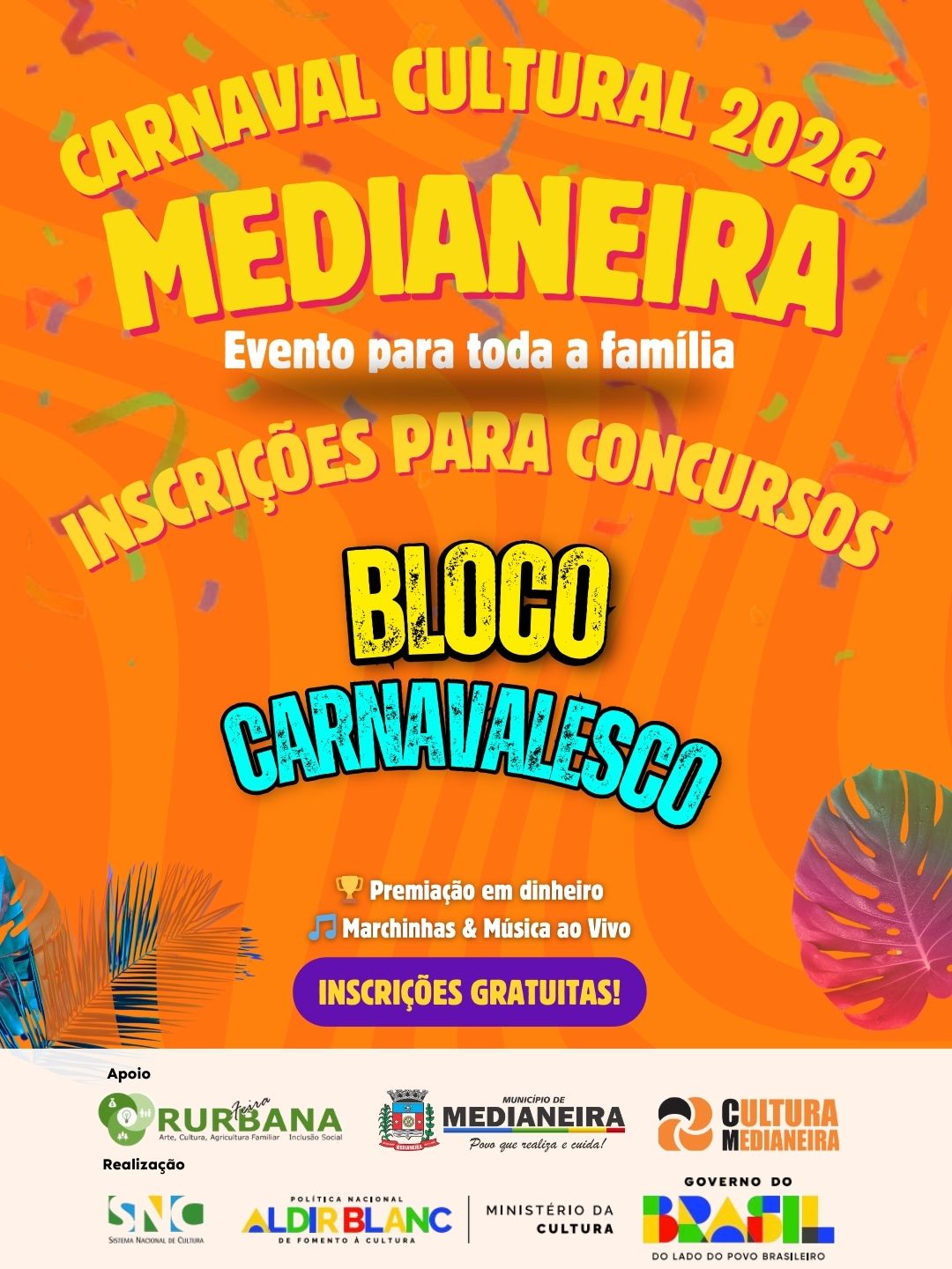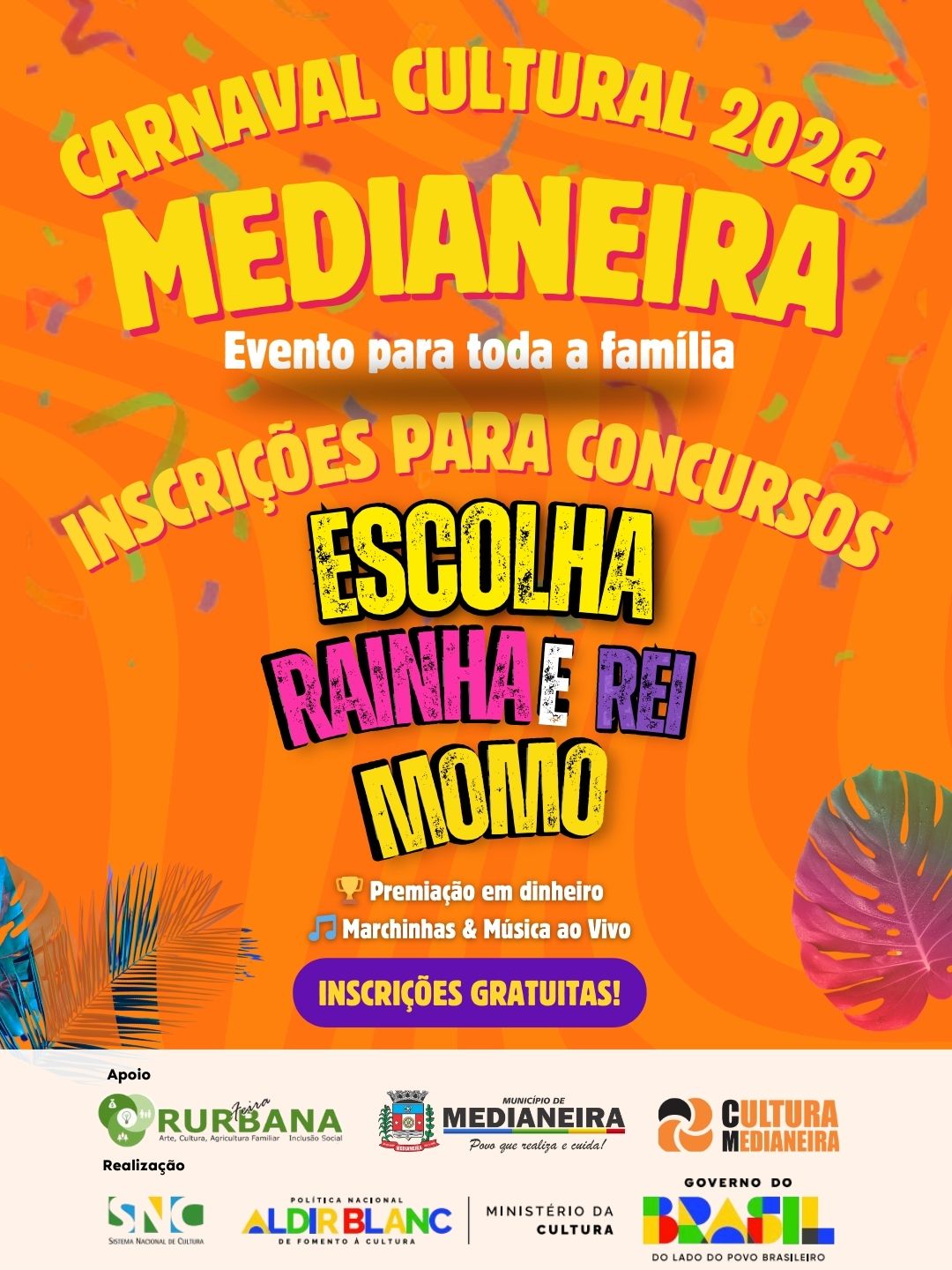 A folia está de volta! Medianeira se prepara para uma noite mágica de tradição e alegria. No dia 16 de fevereiro, o estacionamento da Prefeitura será o cenário do Carnaval Cultural 2026, com música ao vivo, marchinhas e prêmios em dinheiro!