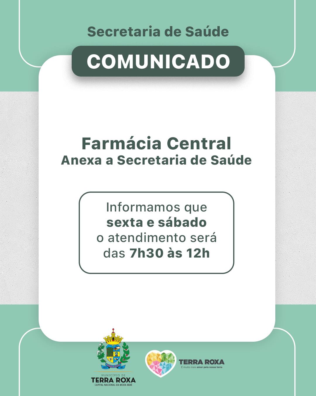 Terra Roxa (PR) – A Farmácia Central, localizada junto à Secretaria Municipal de Saúde, terá horário especial de atendimento nesta semana. A medida visa facilitar o acesso da população aos medicamentos durante o período de recesso parcial nos serviços públicos.