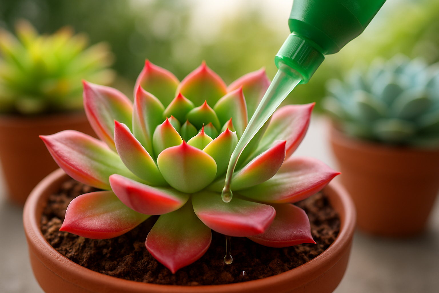 Imagem de uma suculenta sendo fertilizada, com close na aplicação do fertilizante.