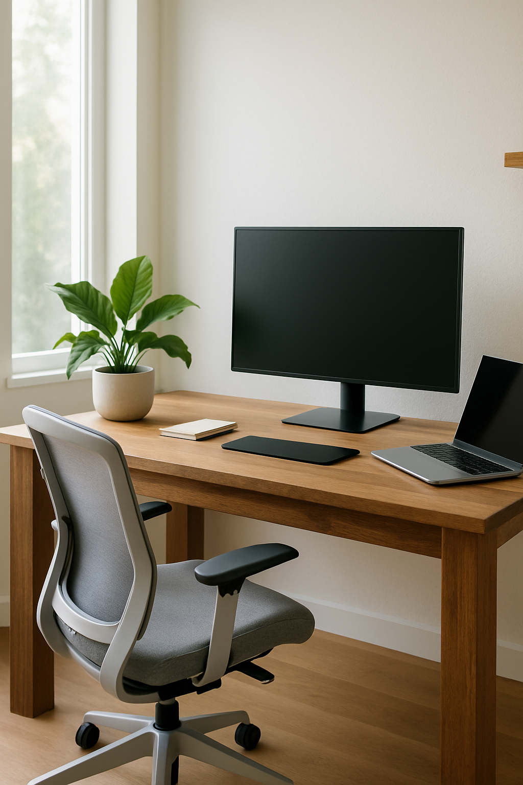 Se você tiver que escolher um único item para investir, que seja a cadeira. Uma boa cadeira ergonômica deve ter, no mínimo: ajuste de altura do assento, apoio para a lombar e braços ajustáveis. Seus pés devem ficar totalmente apoiados no chão (ou em um apoio para pés), e seus joelhos devem formar um ângulo de 90 graus. A cadeira certa previne dores nas costas, no pescoço e melhora sua postura geral.