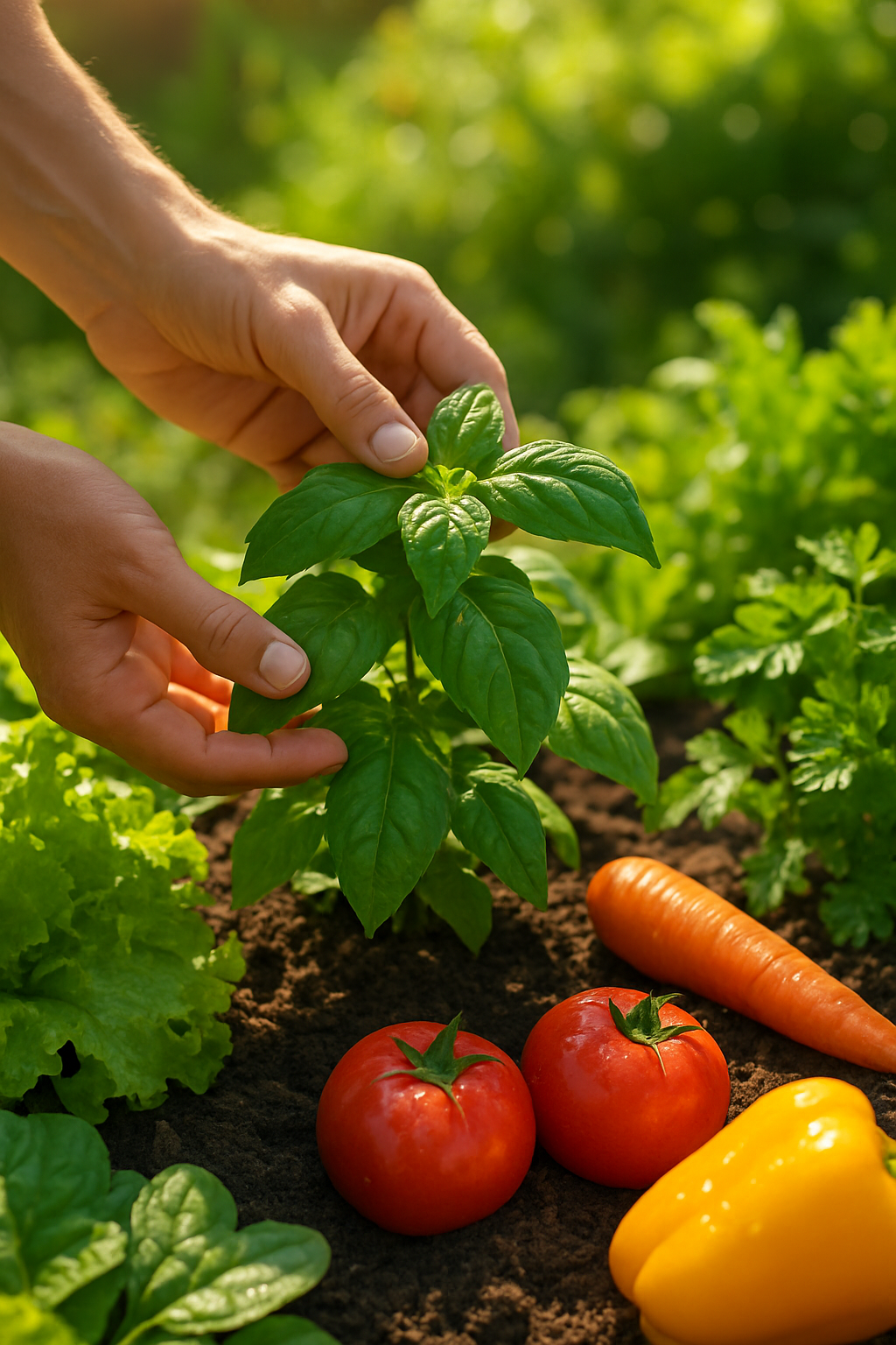 - Plantio Consorciado (Plantas Companheiras): Posicione espécies que se beneficiam mutuamente. O manjericão e o tomate se dão muito bem, assim como cenouras e alecrim. Pesquise combinações para potencializar sua colheita e afastar pragas naturalmente.