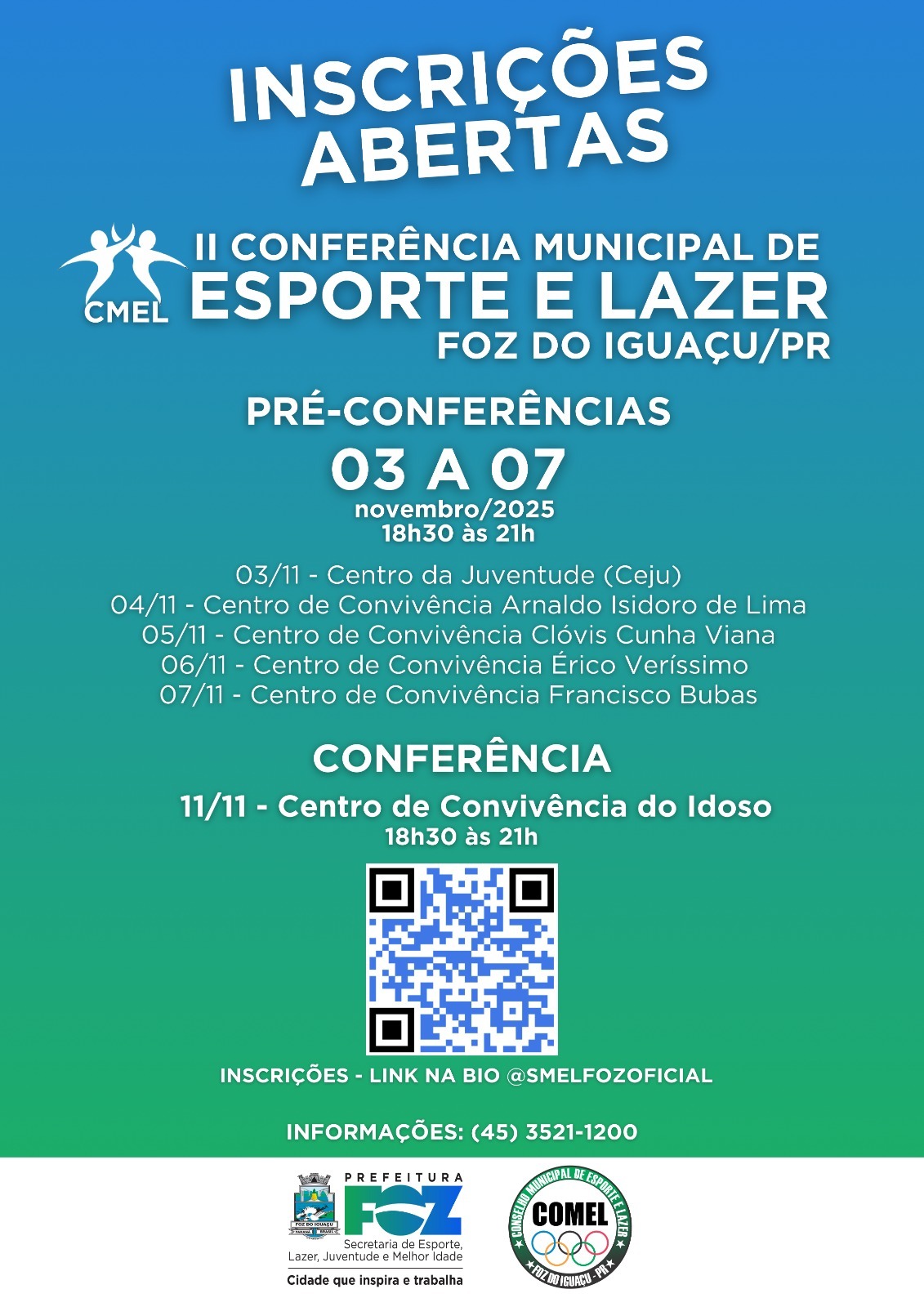 O Conselho Municipal de Esporte e Lazer de Foz do Iguaçu (COMEL/FI), em parceria com a Secretaria de Esporte, Lazer, Juventude e Melhor Idade, convida toda a comunidade esportiva e demais interessados para participarem do evento, que será realizado no dia 11 de novembro de 2025, das 18h30 às 21h, no Centro de Convivência do Idoso.