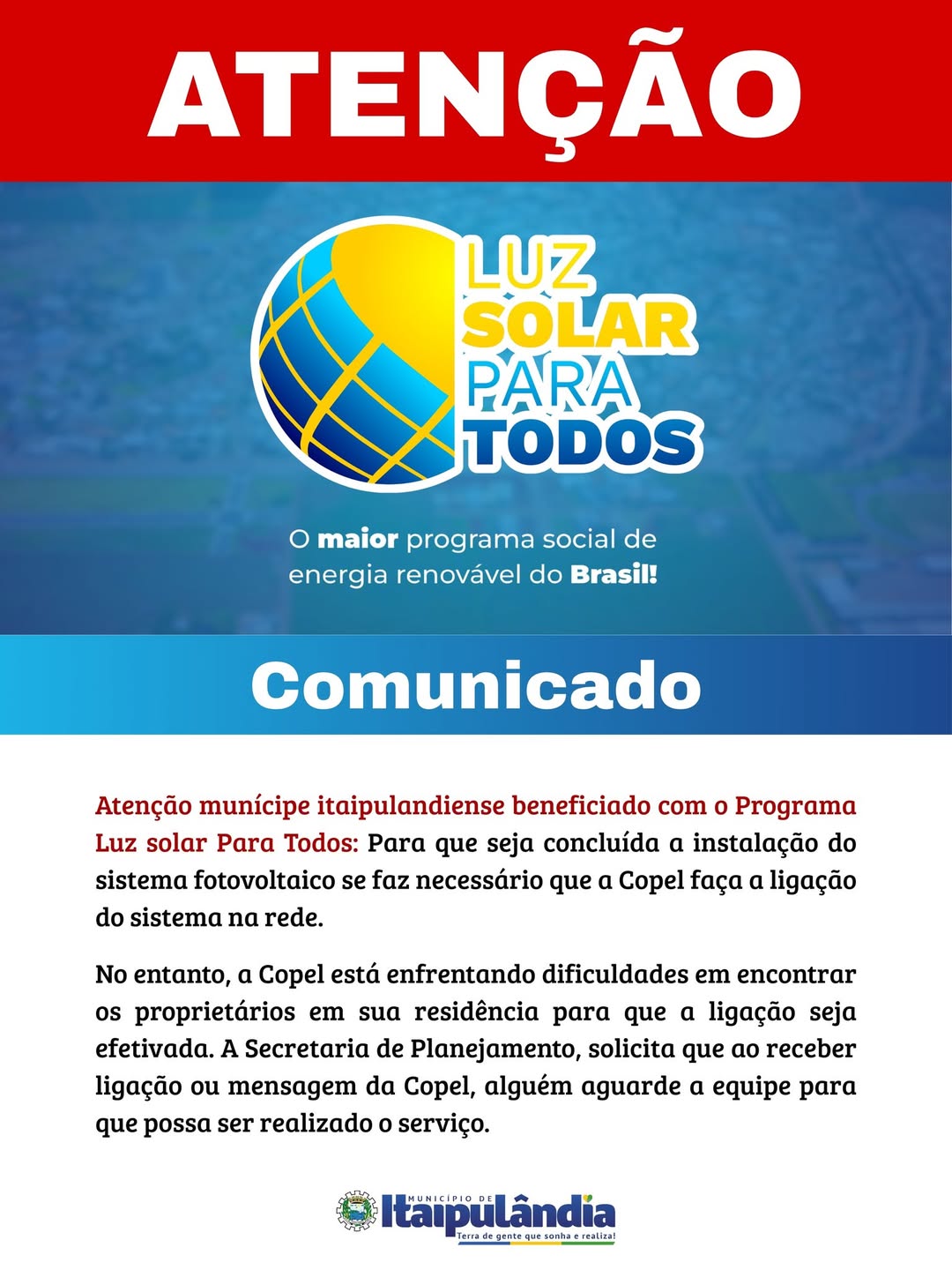 Itaipulândia: Comunicado aos beneficiários do Programa Luz Solar para Todos">