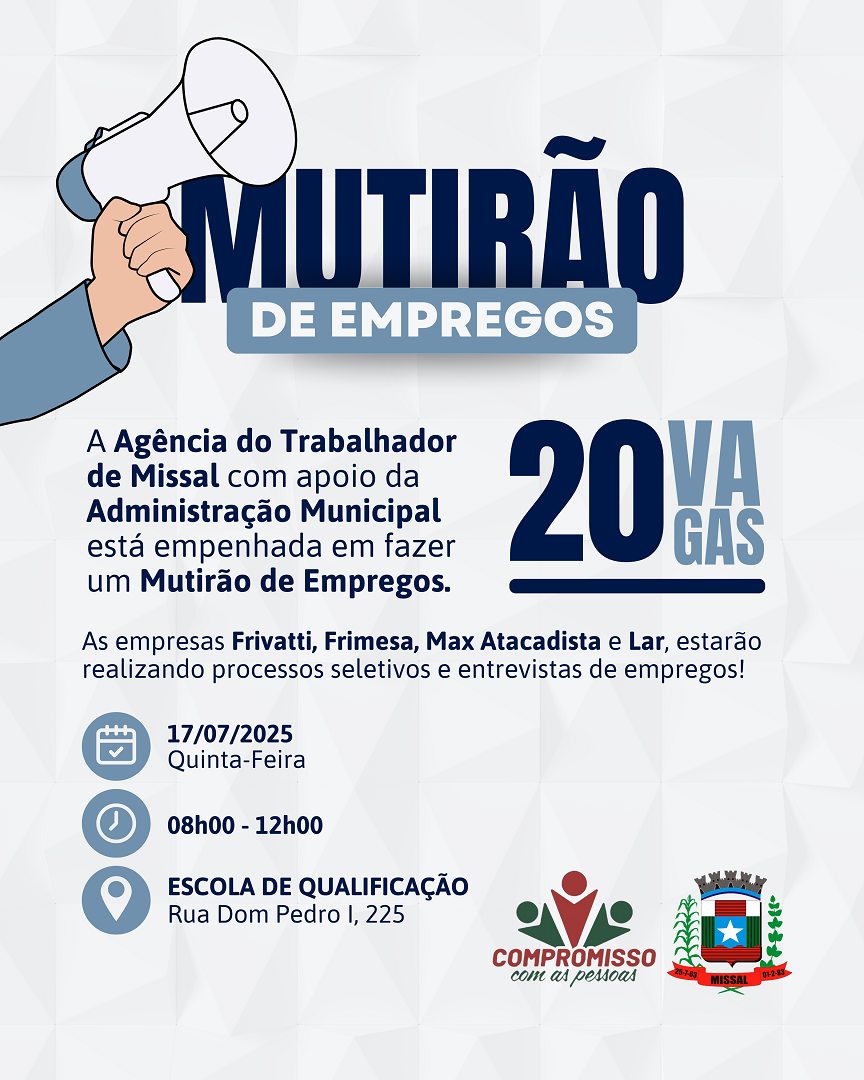 A Agência do Trabalhador de Missal realizará mais uma edição do Mutirão de Empregos no dia 17 de julho, uma quinta-feira, das 8h às 12h, na Escola de Qualificação. Serão ofertadas 20 vagas de trabalho com entrevistas feitas no local.