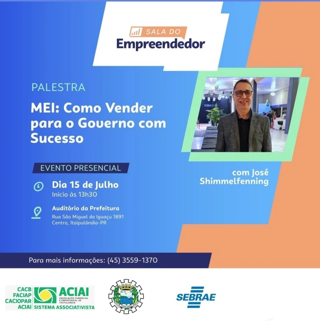 No próximo dia 15 de julho, a Secretaria de Indústria e Comércio, por meio da Sala do Empreendedor e em parceria com o Sebrae, promoverá a palestra Como vender para o Governo com sucesso. O evento acontecerá às 13h30, no auditório do Paço Municipal de Itaipulândia.