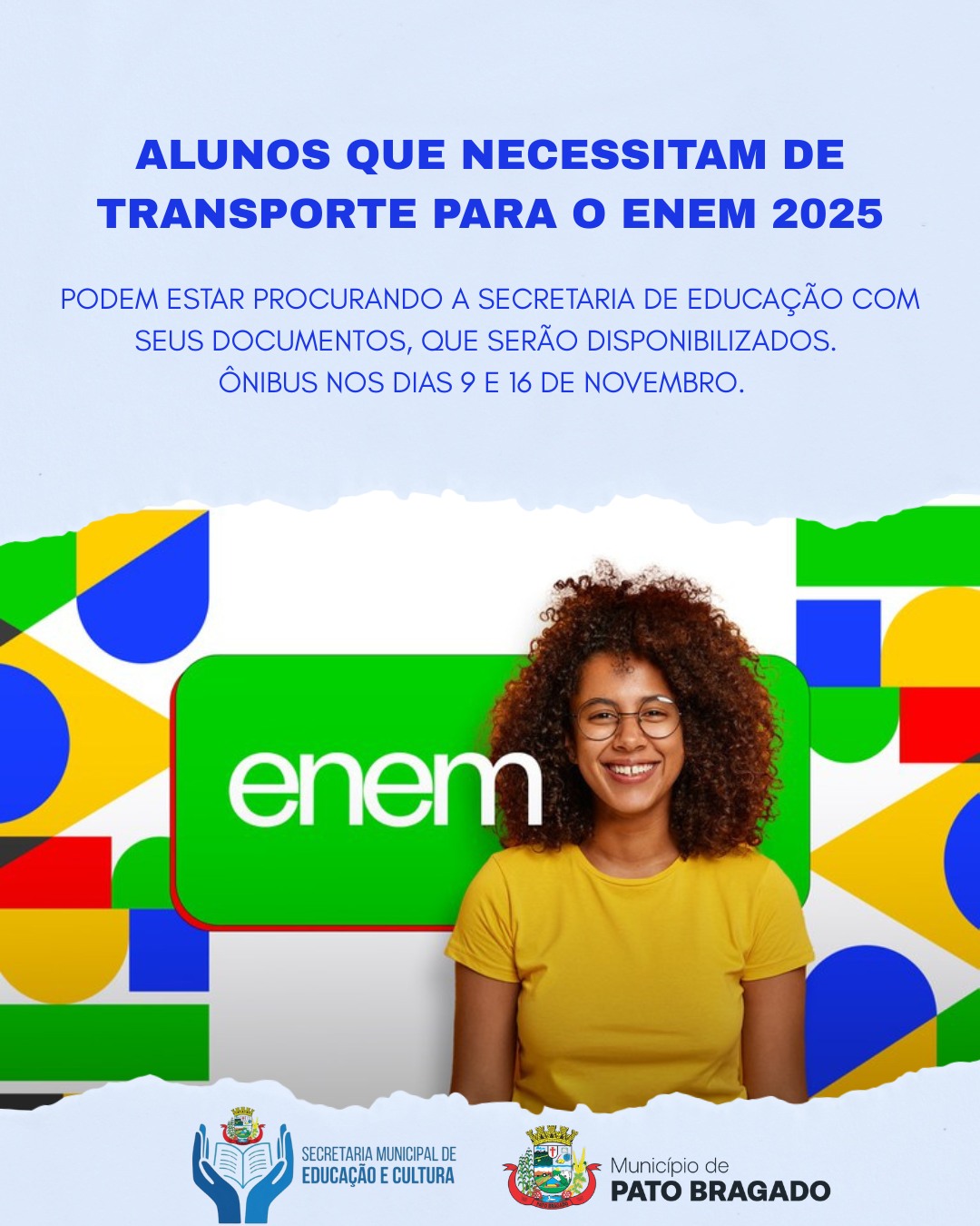 ENEM 2025, transporte gratuito ENEM, Pato Bragado, Secretaria de Educação, Centro Cultural Pato Bragado, transporte escolar, estudantes do ENEM, provas do ENEM, inscrição transporte ENEM, apoio aos estudantes, educação Pato Bragado, ensino médio, logística ENEM, blog do lago, oportunidade estudantil