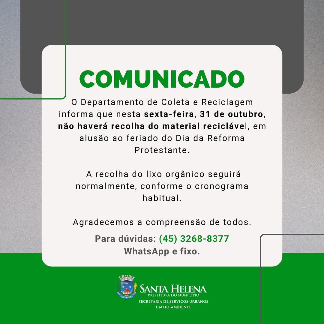 O Departamento de Coleta e Reciclagem de Santa Helena informa que nesta sexta-feira, 31 de outubro, a coleta de material reciclável não será realizada devido ao feriado do Dia da Reforma Protestante.
