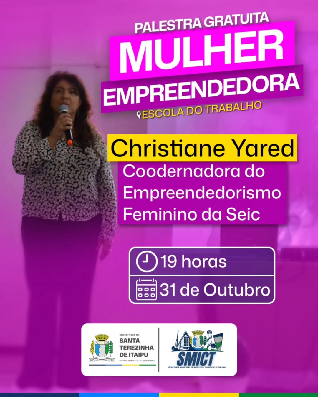 Palestra Mulher Empreendedora em Santa Terezinha de Itaipu com Christiane Yared A Prefeitura de Santa Terezinha de Itaipu, por meio…