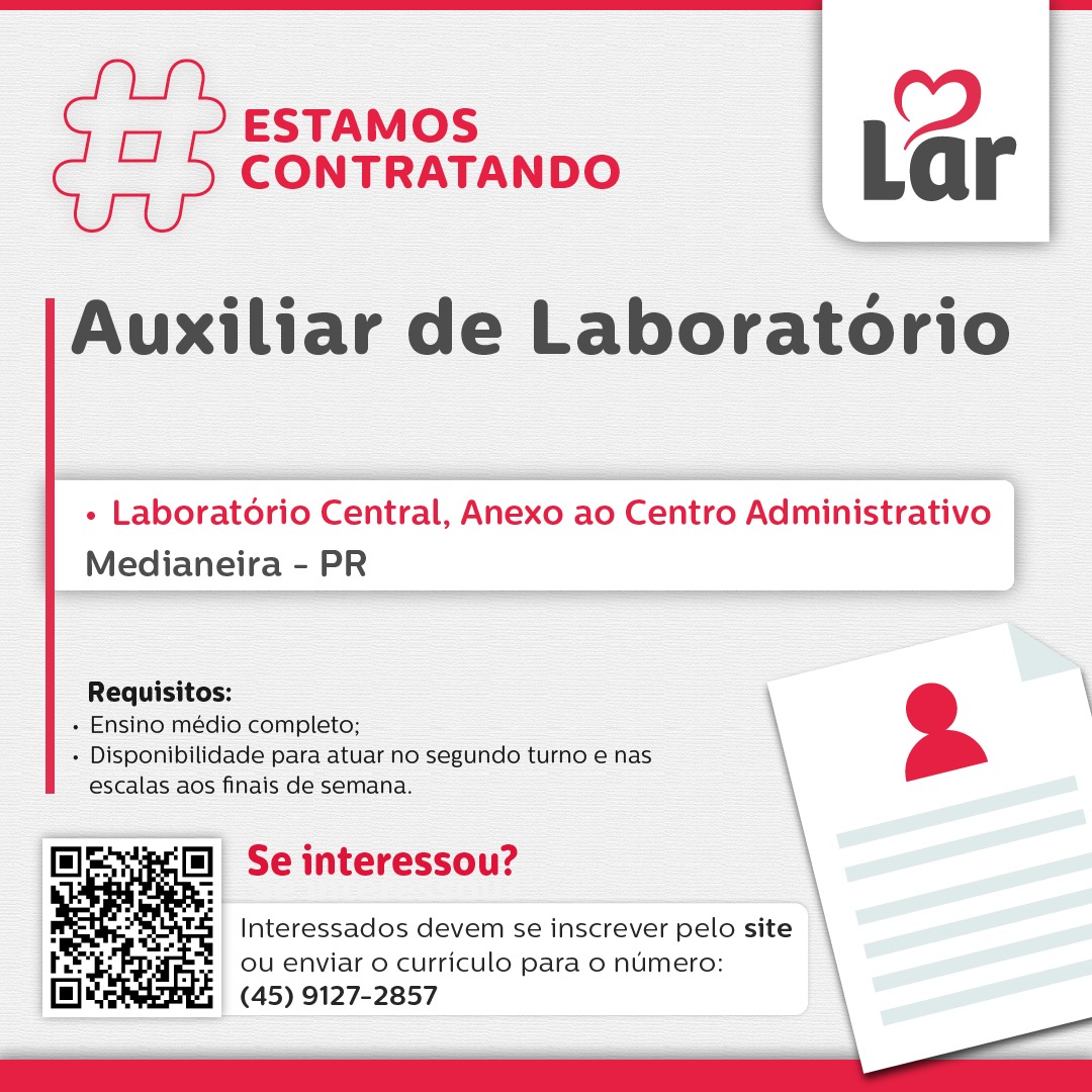 A **Lar Cooperativa** está com oportunidade de emprego aberta em **Medianeira (PR)**. A vaga é para **Auxiliar de Laboratório**, no Laboratório Central da cooperativa.