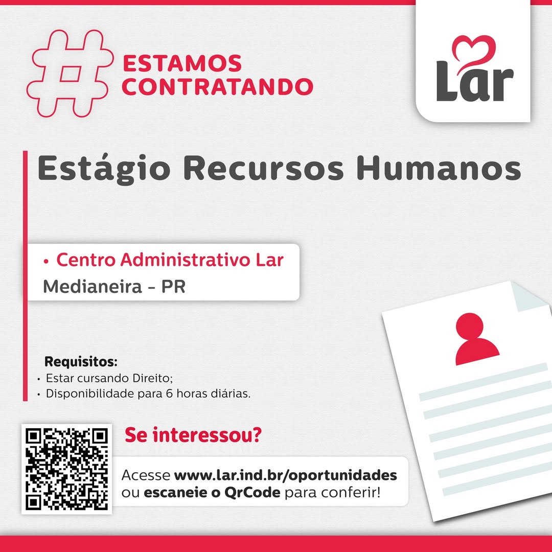 O Centro Administrativo Lar em Medianeira (PR) está com oportunidade aberta para Estágio em Recursos Humanos. É a chance de integrar a equipe da Lar Cooperativa e desenvolver experiência prática na área.