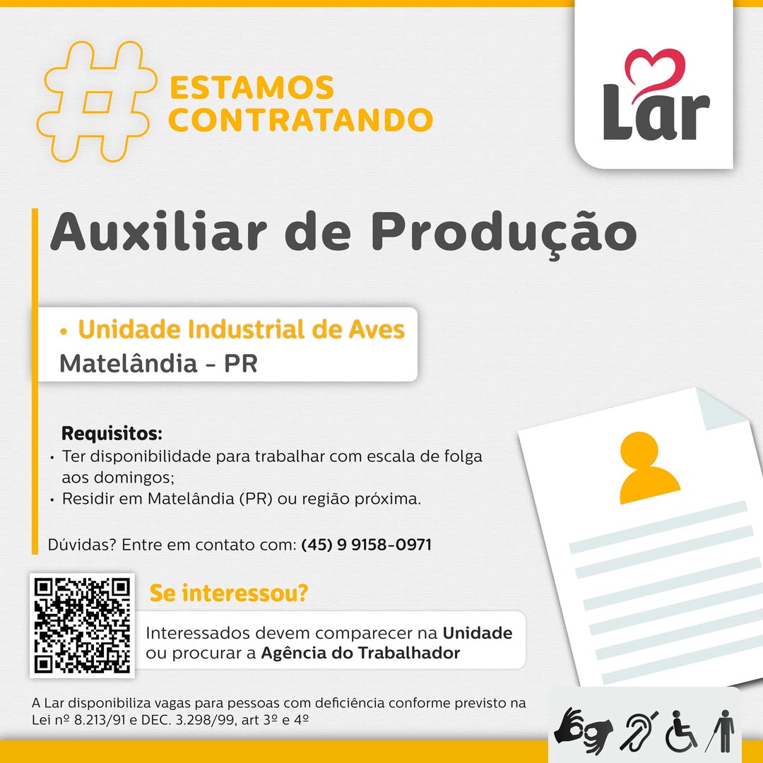 Vaga em Matelândia, Lar Cooperativa, Auxiliar de Produção, emprego Matelândia, oportunidade de trabalho, cooperativa agroindustrial, Agência do Trabalhador Matelândia, unidade industrial de aves, Lar Agroindustrial, vagas Oeste do Paraná, mercado de trabalho, contratação imediata, emprego no Paraná, oportunidades Lar, carreira cooperativa