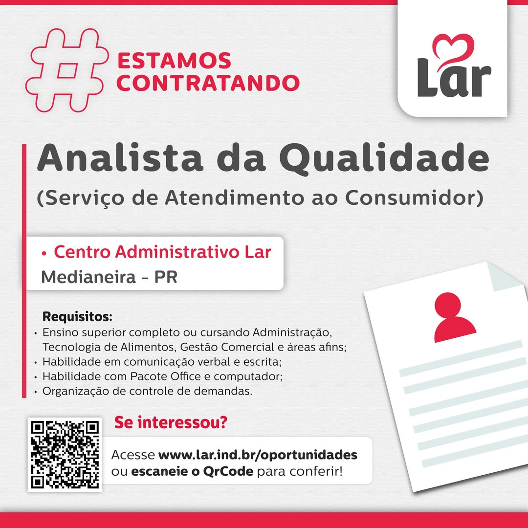 vaga em Medianeira, Lar Cooperativa, analista da qualidade, SAC Lar, emprego em Medianeira, oportunidade de trabalho, Lar Agroindustrial, cooperativa do Paraná, vagas abertas Medianeira, centro administrativo Lar, inscrição Lar oportunidades, analista SAC, trabalhar na Lar, Lar contrata, carreira em cooperativa