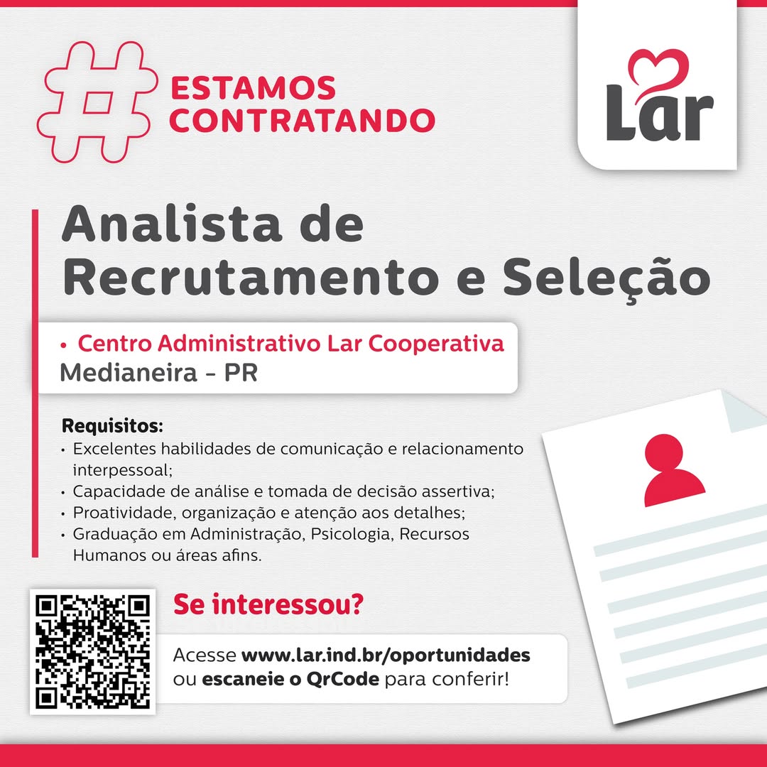 Uma nova vaga de emprego em Medianeira está disponível para profissionais da área de Recursos Humanos. A Lar Cooperativa Agroindustrial está com inscrições abertas para o cargo de Analista de Recrutamento e Seleção, com atuação no Centro Administrativo, localizado no município.