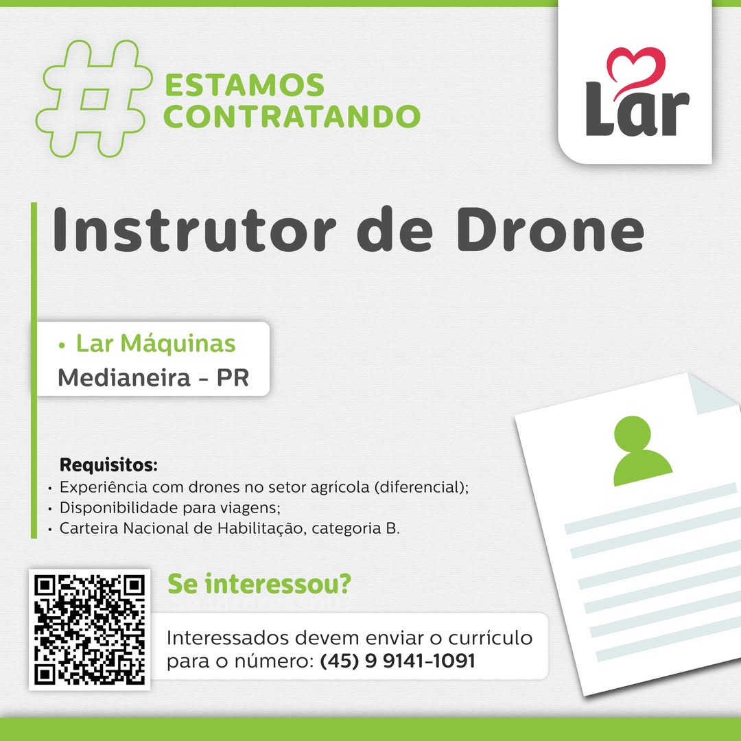 vaga Medianeira, oportunidade emprego Medianeira, instrutor de drone, Lar Máquinas, Lar Cooperativa, emprego Paraná, enviar currículo drone, carreira drone, vaga drone Medianeira, trabalho Medianeira, oportunidade profissional, tecnologia drone, capacitação drone, setor industrial drone, equipe Lar Cooperativa
