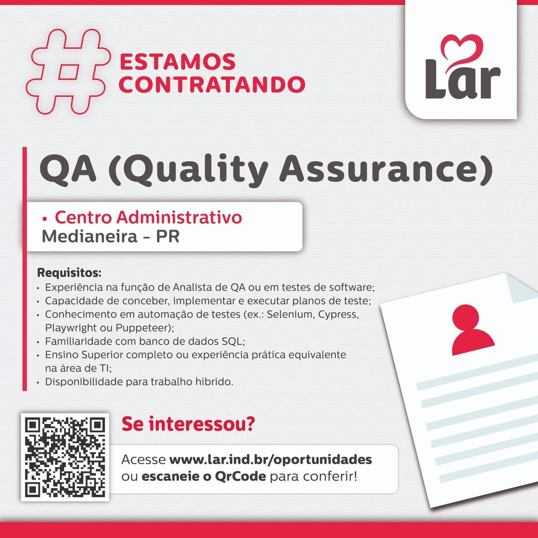 vaga para QA em Medianeira, QA Lar Cooperativa, emprego Medianeira PR, oportunidade QA Paraná, trabalhar na Lar, centro administrativo Lar, inscrição QA Lar, www.lar.ind.br, cooperativa agroindustrial, vagas abertas Medianeira, qualidade de software Lar, área administrativa QA, carreira QA Paraná, emprego tecnologia Medianeira, Vagas Lar Cooperativa 2025