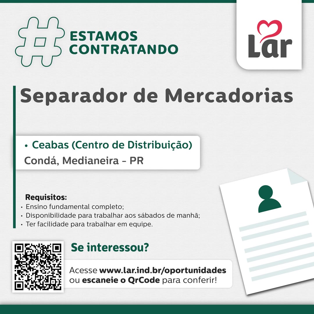Está aberta uma oportunidade de emprego para o cargo de Separador de Mercadorias na unidade Ceabas (Centro de Distribuição) da Lar Cooperativa, localizada em Medianeira (PR).