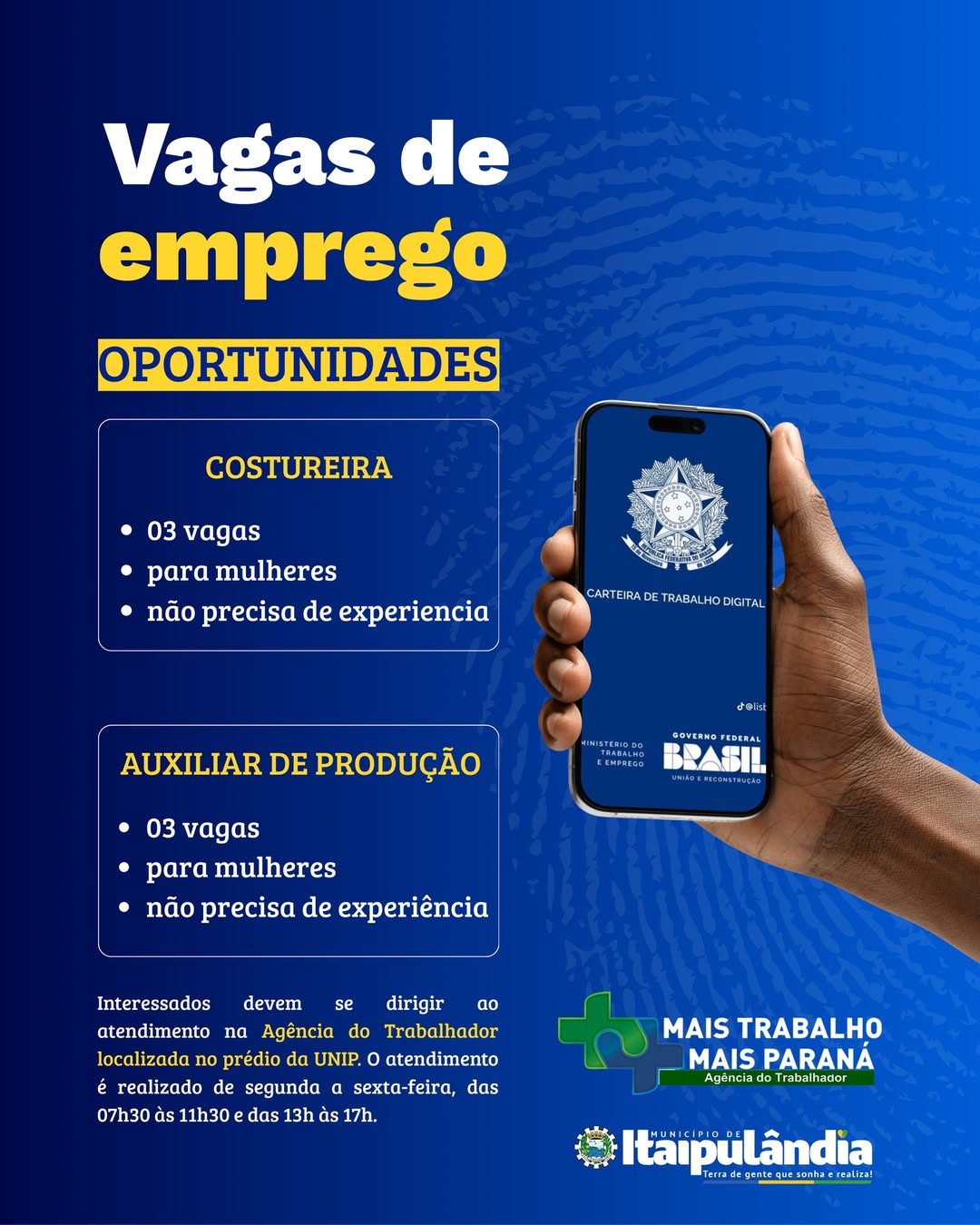 A Agência do Trabalhador de Itaipulândia anunciou novas oportunidades de emprego. São vagas destinadas a mulheres, com contratação imediata e sem necessidade de experiência prévia.