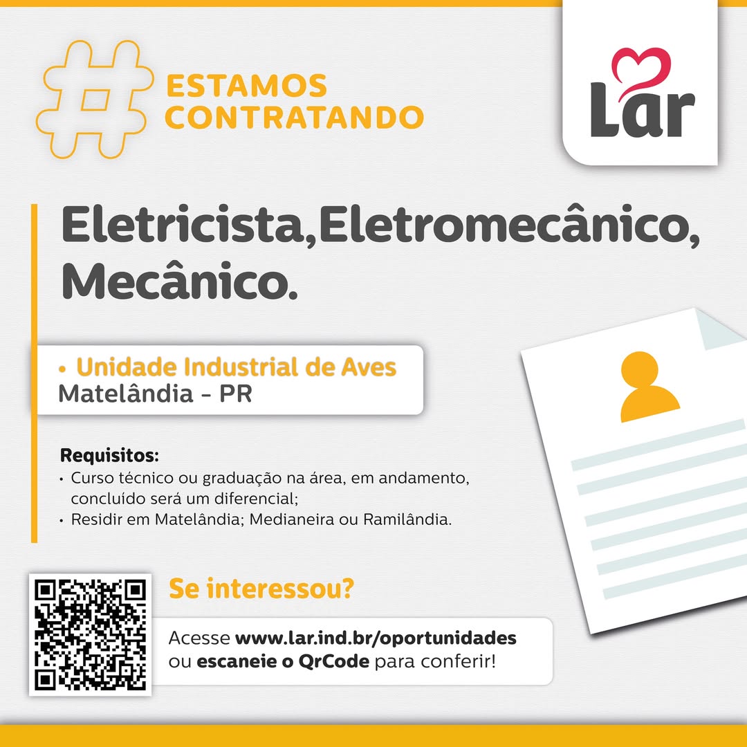 vaga Matelândia, oportunidades Matelândia, Lar Cooperativa, vagas Eletricista Matelândia, vagas Eletromecânico Matelândia, vagas Mecânico Matelândia, empregos Matelândia 2025, unidade industrial aves, empregos Paraná, Lar Cooperativa vagas
