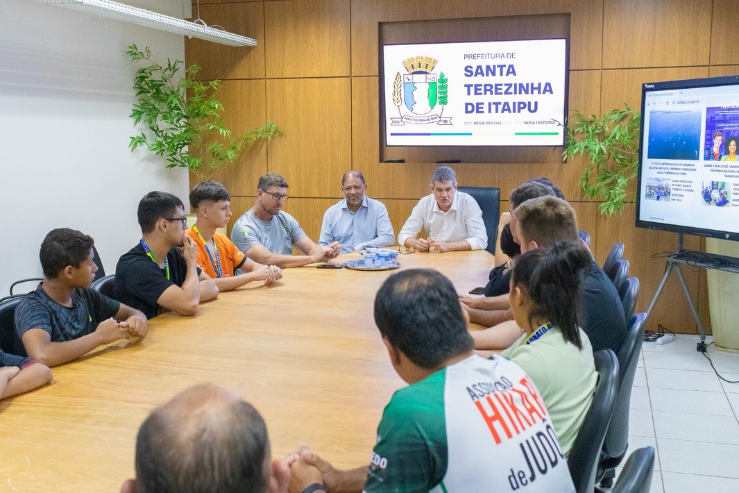 O prefeito Bim, acompanhado do vice-prefeito Dr. Pedro e do secretário municipal de Esportes, Diogo Benedet, fez questão de abrir as portas do gabinete para parabenizar pessoalmente os 11 atletas que representaram o município com tanta garra.